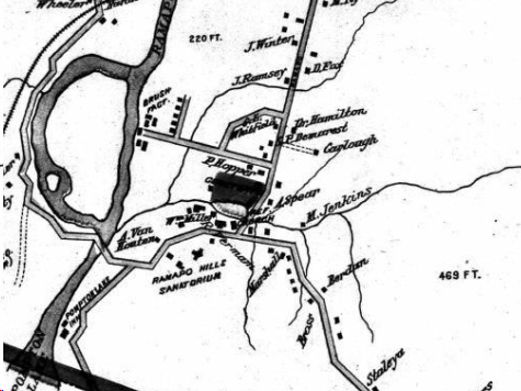 First, James Post owned the Hansen House property as shown in the 1876 map above and built a structure virtually on the road. By 1900 he no longer owned it as by then it was owned by Florence Vernam, the wife of a wealthy Brooklyn New York real estate developer. The Vernam family moved to Oakland in 1892. Also, Mr. Post also sold his property West and North of the Ponds Church to William Muller, a wealthy baker from New York City. Mr. Muller also moved to Oakland around 1890. And finally, we see the first appearance of the Ramapo Hills Sanitorium across the road from the Ponds Church. The Sanitorium was a major complex with a huge Victorian building at its center. Hence at that small intersection, we have the real estate interplay of three wealthy outsiders each acquiring significant land holdings from local farmers in Oakland. Oakland at that time was fast becoming the ‘South Hampton’ of Bergen County.